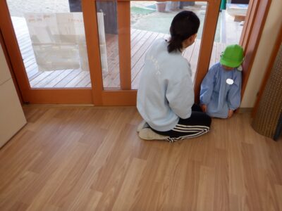 登園してきた子ども。出迎えて、背を丸め、子どもをまるごと受けとめる先生の姿。あたたかさが伝わってきますね。