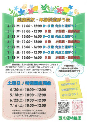 2024.04.08 あそぼう会 ちゅーりっぷ組 園庭開放・遊ぼう会🌳 もうすぐ新年度が始まります🌸今年度は少しパワーアップ‼️ 🔆園庭開放 🔆0~3歳さんの先生と遊ぼう会 🔆0歳さんのお部屋開放日 🔆土曜日の特別園庭開放 など、ちいさいお友だちが幼稚園で遊べる日をたくさん用意しました!! 西京極幼稚園にぜひぜひぜひ!遊びにきてくださいね😄🎈🎈 そして、未就園親子クラス (2歳児ちゅうりっぷぐみ🌷、1歳児ふたばぐみ🌱)も、まだまだ募集しています!お電話お待ちしています💕