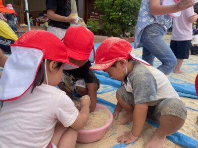 2025.05.30 幼稚園日誌 年少組*こめぬか遊び ゆり組(3歳児)が初めての米ぬか遊びをしました♪ ふわっふわ~♡ 魔法のこなみた~い! 初めての感覚にワクワクがとまりませんでした! さて。。。続きは。。。またお楽しみに!
