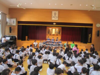 今日は、ゆりぐみ・すみれぐみ・さくらぐみのみんなが初めて講堂に集まってお参仏をしました(*^-^*)